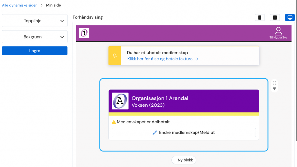 Felles for dynamiske sider er at på venstre side finn du innstillingar for topplinje og bakgrunn. Til høgre finn du ei førehandsvisning og du kan sjå korleis det ser ut på PC-skjerm, nettbrett og mobil.